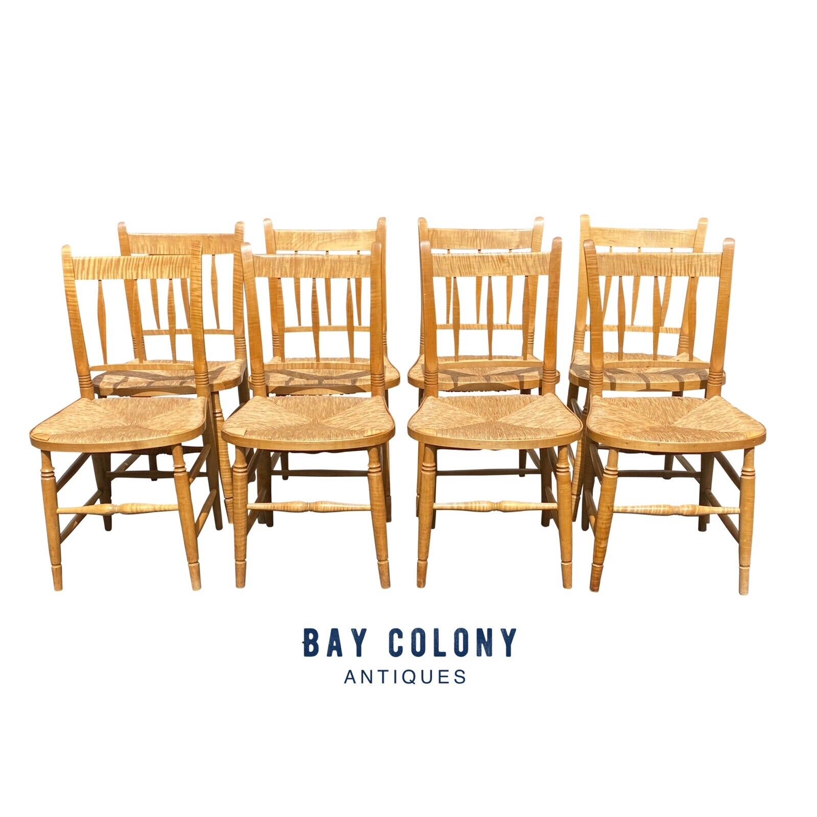 With our absolute highest compliments Bay Colony Antiques takes the distinct pleasure in offering a spectacular set of eight tiger maple dining chairs. These chairs were constructed to the exact same standards as any fine traditional early American windsor thumb back chair of the late 18th century. Throughout the American federal period windsor chairs in the thumb back fashion were produced all throughout New England and the tri-state areas particularly in the countryside where the style was most heavily favored. Thumb back chairs are denoted for the curved form of the chair back which is contoured similarly to the natural curvature of a thumb. This interpretation of the American windsor chair form is superior to the standard antique windsor chair as it provides more comfort compared to a straight back formed chair and demonstrates the superior skills of an experienced chair maker. Collectors of early American antiques in the past few decades have driven up the prices of matching antique windsor chairs in sets of four, six, and eight to record high pricing with most auctioneers and dealers reasonably expecting in excess of a thousand dollars per chair for any matching sets. Out of all the sets that are known to exist expertly grain painted chairs and solid tiger maple chairs command the highest values and competition among passionate collectors. This set of chairs was produced by an expert chairmaker forty years ago as a wedding present for his daughter who ultimately sold them to us after many years of gentle use and admiration. It was our privilege to bring this set of chairs back to New England with us as they had traveled all the way to coastal California. These chairs are entirely made of solid tiger maple and are each well formed and contoured for comfort. The chairs are very sturdy and well suited for generations of continued use. Each chair features an arrow back form with three curved splats comprising the back rest. The seats are made from hand tied rush which remain quite strong and have compass form hooped seats. The chairs are supported by finely turned legs and a turned medial stretcher and have double stretcher supports on either side.