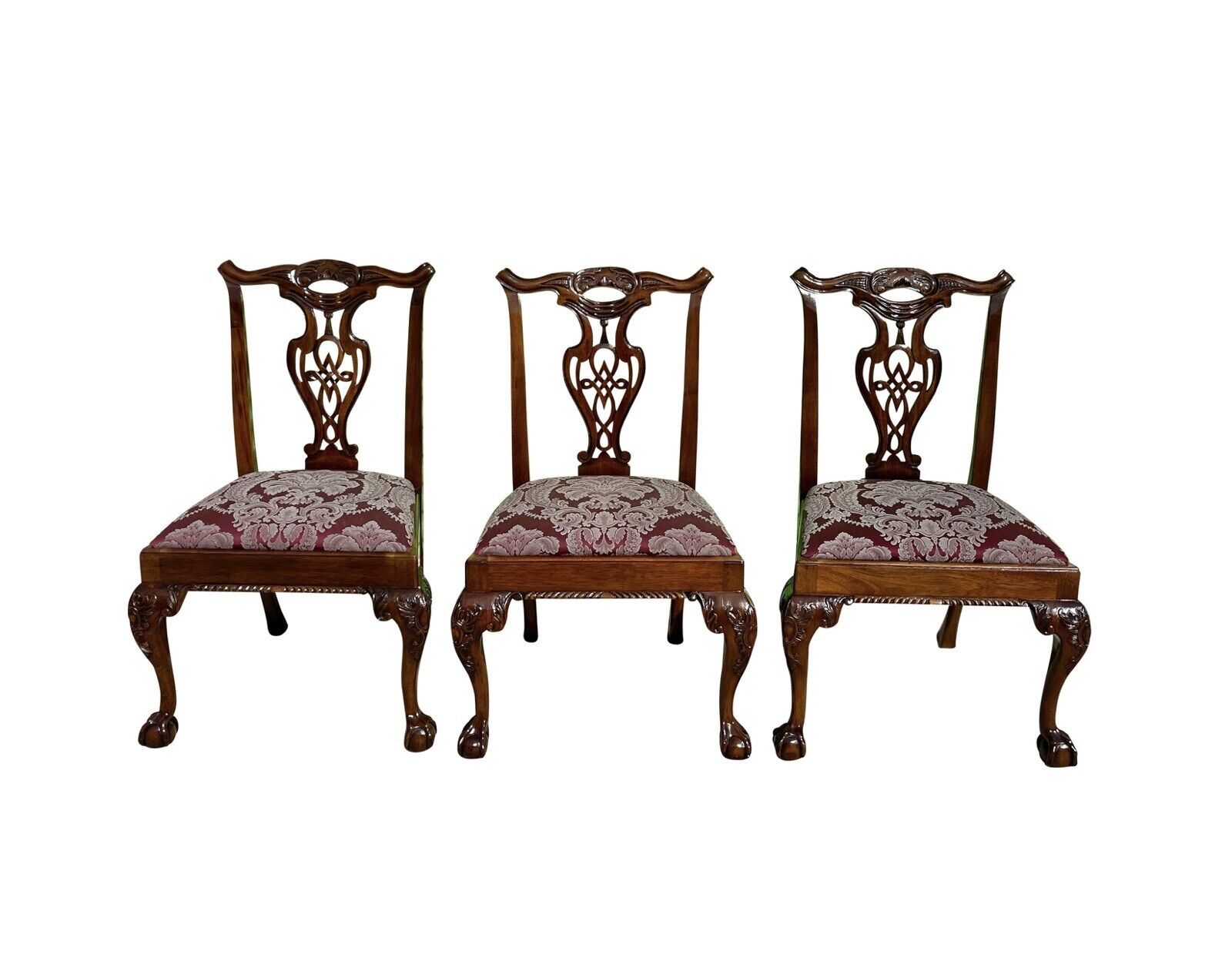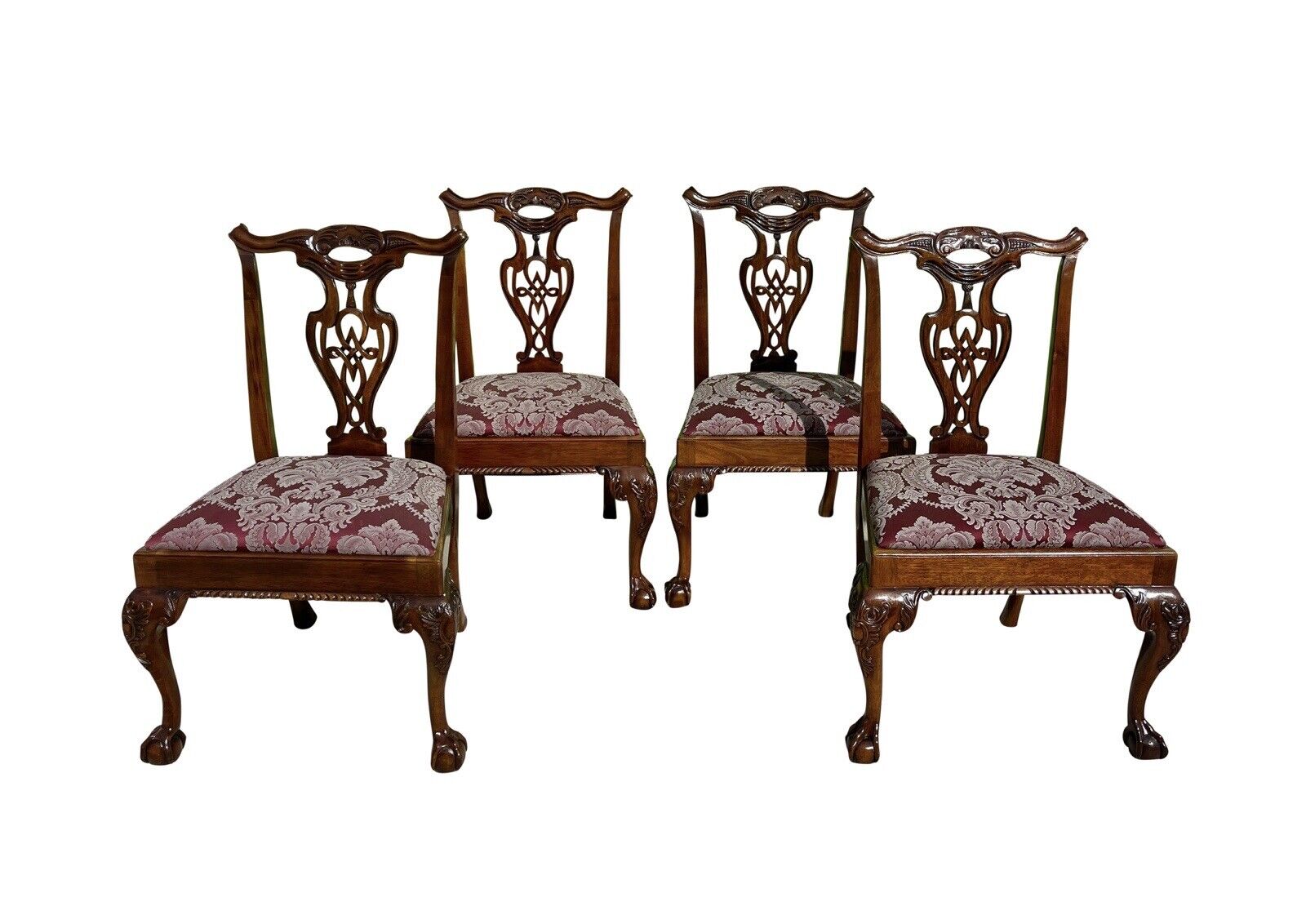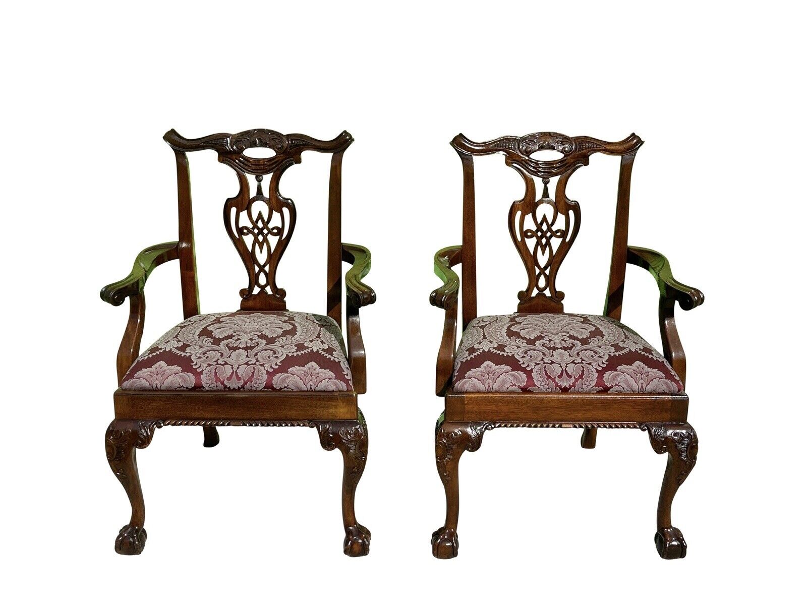 With our highest compliments Bay Colony Antiques takes the great pleasure in offering for sale a spectacular set of dining chairs by the Henredon furniture company. Each chair is crafted to the absolute highest standards of 20th century furniture production as Henredon remained among the elite makers of fine furniture in America along with Baker and Henkel Harris at a time where quality furniture production was in sharp decline. The traditional style of the chairs are fashioned in the early Chippendale style with a central carved tassel-back design which was a feature of the finest chairmakers in Philadelphia during the 18th century. The chairs have well formed and shaped crest with rolled ears and carved elements. The chairbacks are formed with a traditional baluster vase form with gothic influenced pierced carvings and intricate interlacing elements centered by the tassel-back motif. Each chair has exceptional carving work at the chair knees and are raised on well formed ball and claw feet. The chair seats have gadrooned carvings along the frame and feature cloth damask patterned upholstery which is clean and well suited for future use. Each chair frame is solid and very sturdy without any issues to note and will be perfect for everyday use for generations to come. We don't have the sizes of the armchairs on hand but the side chairs measure 24 1/2" wide x 23" deep x 37 1/2" tall with an 18 1/2" seat height.