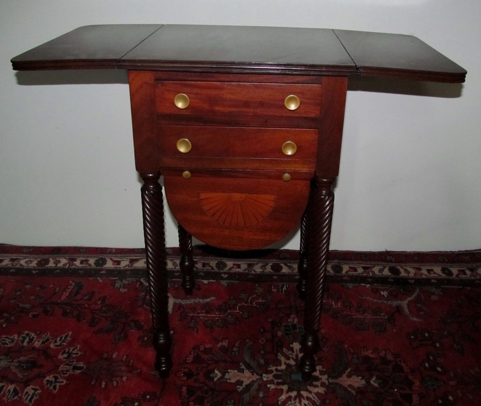With our compliments we are pleased to offer you this great Sheraton style late 19th century mahogany three drawer work table with a large satinwood inlaid sunburst on its sow belly facing. It has drop leaves detailed by an incised table edge and fine variation of Sheraton period rope carved legs. This three drawer work table is in a very unusual and hard to find format. It is 17" long, 16" wide (deep), 30" tall and 31 1/2" long with its drop leaves locked up.
