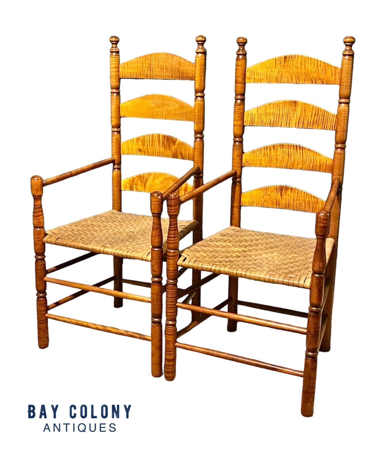 Vintage Pair of William & Mary Style Tiger Maple Ladder Back Armchairs